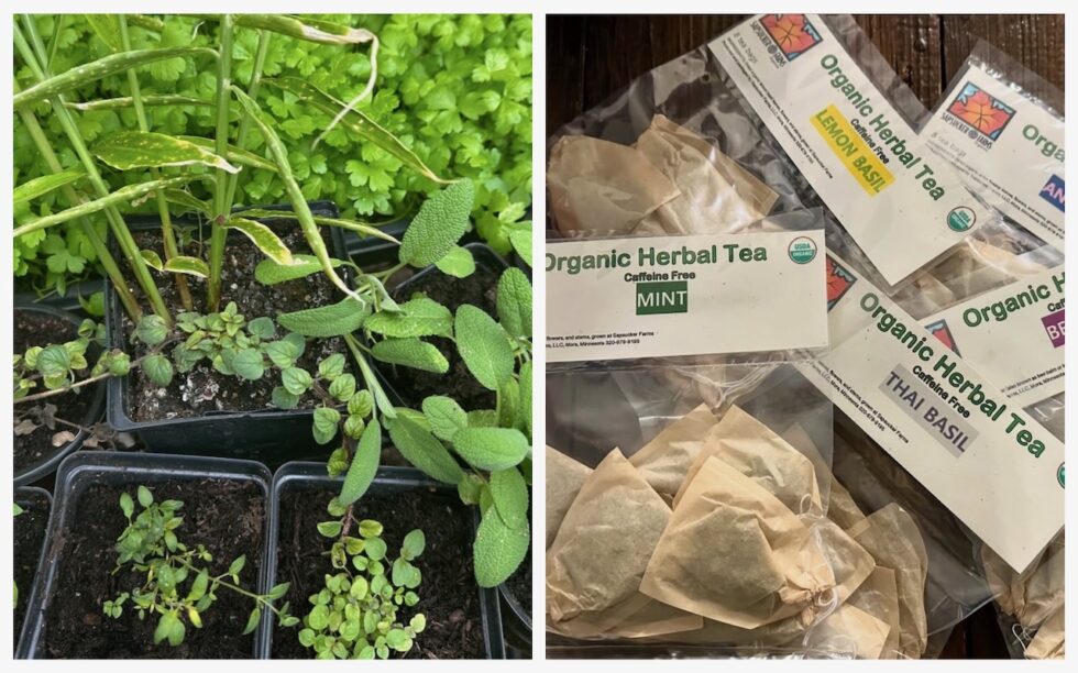 Delicious herbal teas made from organic herbs and spices grown right here on the farm. Current options include: lemon basil, ginger, turmeric, ginger/turmeric, Thai basil, mint, bee balm, anise hyssop and anything else we can grow and dry. Complement a cup of tea with a spoonful of our honey from the farm.